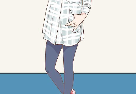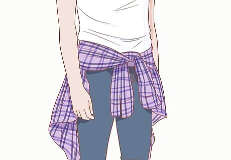 Tie a long-sleeved flannel around your waist for a laid-back vibe. This is a great way to add a checked shirt to your ensemble without having to commit to actually wearing it all day long. It’s especially good for those days that might be warm but also could cool off later in the day, or vice versa. Wear a looser fitting T-shirt that is a solid color, like white, black, or gray. Take an unbuttoned long-sleeved flannel, bring the sleeves around your waist, and create a quick knot to secure the shirt. Wear flats or athletic shoes to complete the look. You can pair this look with jeans, black leggings, or shorts.