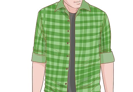 Unbutton your shirt and wear it overtop of a T-shirt for a casual look. Show off a favorite T-shirt, but pick one that isn’t patterned or striped, as the myriad of colors and patterns meshing with the checked shirt could be visually overwhelming. Pick a solid-colored tee, or you could even choose one with words or images on it—just be mindful of how the two tops look when they’re paired together. Wear a pair of cool athletic sneakers to complete this casual look. Leave the T-shirt and the checked shirt untucked to maintain your casual vibe. Make your outfit look more intentional by matching a color in your checked shirt to a part of your T-shirt’s design, or create a more casual look by not matching the colors.