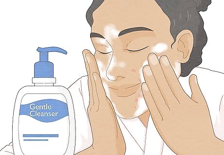 Use a mild, unscented cleanser. Perfumes and dyes may irritate your skin further, so wash your face with a mild cleanser that’s fragrance-free. Gently lather your face with warm water and rub your face with your fingertips, then rinse it off thoroughly. Avoid harshly scrubbing your skin – this won’t make it smoother, and it may irritate your skin more.