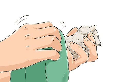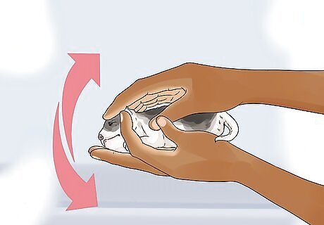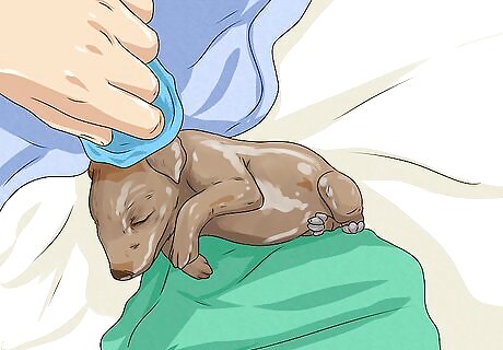 Clear fluid from the lungs. If your pup is making a raspy noise, swing it with a gentle rocking motion. This rasping is caused by fluid collecting in the puppy’s lungs. To remove this fluid, place the puppy in the palm of your hand with its face cradled snugly between your middle and index fingers. Cup your other hand securely over the puppy’s body and make a downward swinging motion with the puppy still in your hands. This will allow the fluid to clear from the lungs. You might need to do this several times to help the puppy stop rasping.