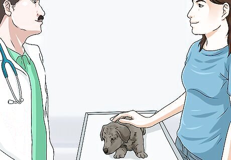 Take your pup to the vet. If there are no immediate health issues, you don’t need to take your pup to the vet until it is six weeks old. At that point, it will be ready for several vaccinations, including distemper, Bordetella, parainfluenza, and measles. Over the course of the next few months, your puppy will need to receive additional shots and get regular checkups. If you have any questions about how to raise your puppy, ask your doctor when you visit. For instance, you might ask, “What sort of food should I give my puppy?” or “When should I begin giving my puppy exercise?”