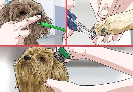 Start grooming your pup weekly. After two weeks, you should start taking a close look at particular grooming and hygiene issues that will need ongoing care. Specifically, you should find time to brush your dog’s teeth, trim its nails, and brush its coat. Trim your pup’s nails weekly. Trimming the nails can be traumatic for adults, but if you begin trimming your puppy’s nails, it will learn that trimming is an easy process that they can expect regularly. Start trimming your puppy’s nails after it is two weeks old. You can use regular human nail trimming scissors to trim your puppy’s nails. Older dogs usually need specialty trimmers like guillotine trimmers to get their nails cut. Puppies have softer nails, though, and don’t need special trimmers. Puppy teeth start coming in after two weeks.