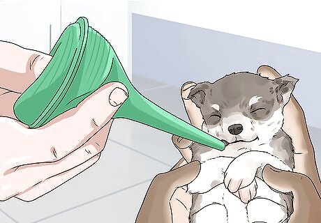 Use a syringe to remove visible fluid. If your puppy is coughing, it might have placental fluid in its mouth. Check its mouth and throat for fluid. If you see any, use a bulb syringe to remove it. Gently open your puppy’s mouth with one hand and squeeze the bulbous end of the bulb syringe with your other. Insert the pointed end of the syringe into your puppy’s mouth and gently release the bulbous end of the bulb syringe so that it sucks up any liquid in your puppy’s mouth.