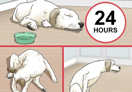 Look for signs that your dog will give birth. When your dog is close to giving birth, she will stop eating for about 24 hours before whelping. Other signs include licking the vulva and mild abdominal cramping. You can detect abdominal pain due to your dog’s mild whimpering. Your dog might also shiver, pace back and forth, pant heavily, and vomit. Do not look for signs that may or may not appear. Specifically, some dogs experience a drop in rectal temperature when they are close to giving birth – from the normal temperature of 101-102 degrees Fahrenheit down to 100-101 degrees Fahrenheit. However, many dogs do not experience this drop in temperature. Whether you do or do not detect this drop in rectal temperature, there are other, more reliable signs that your dog is close to giving birth, so use those instead. Look for the water sac. The water sac is a grayish, balloon-like blob that emerges from your dog’s vulva. Your dog might nip or tug at the sac, allowing the clear fluid to escape. This means your dog will give birth in about one hour.