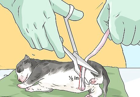 Cut the puppy’s umbilical cord. The umbilical cord is a long tube connecting the puppy’s abdomen to the mother’s uterus. While your doggie is pregnant, the umbilical cord carries nutrients to the developing puppy. But after the puppy is born, there is no need for the umbilical cord. Your dog should gnaw the umbilical cord until it comes off. But in the event that your dog doesn’t, you should do it yourself. Measure the umbilical cord away from the puppy’s body to a length of ½ an inch (1 centimeter). Tie the cord with a piece of thread or unwaxed dental floss so that it is squeezed slightly. Snip the cord at the place where you tied it. The remaining bit will shrivel up and drop off in a few days.