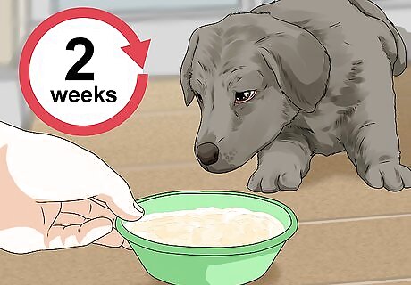 Introduce food to your puppy. After two weeks, your pup will start showing teeth. Start replacing one of your puppy’s meals with a bowl of milk replacer each day. Look for specialty puppy foods at your pet store and ensure that your puppy’s food is soft and mushy. You can soften food that you think is not soft enough by mixing it with a few spoonfuls of water. After your pup is three weeks old, you can begin to feed it standard meals of puppy dog food.