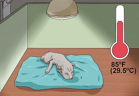 Keep the puppy warm. Puppies are sensitive to heat and cold. Your whelping box should be about 85 degrees Fahrenheit (29.5 degrees Celsius). Use a heat lamp suspended above the whelping box to keep the whelping box toasty. Measure the temperature within the box using a thermometer. You might need to adjust the distance of the heat lamp from the whelping box in order to achieve the desired temperature. For instance, if it’s too cold, move the lamp closer to the whelping box. If it’s too hot in the whelping box, remove the heat lamp some distance away. After a week, drop the temperature of the whelping box around 80-83 degrees Fahrenheit (26.5-28 degrees Celsius).