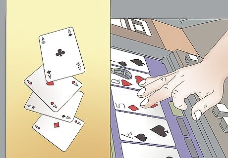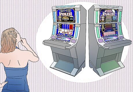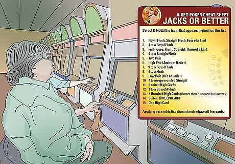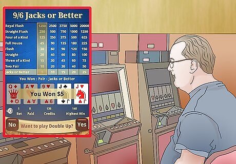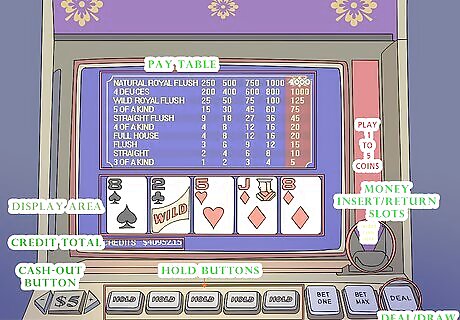 Know the components of the machine. On and around the screen of a video poker game you will see a few different things that are important to understand before playing a game. Paytable: This is the table on the poker screen that shows you how much each hand in a poker game is worth. As previously stated, you'll want to choose a table that has the best paytable, meaning the highest payout for a win. Each paytable will show you how many coins you'll get in return for winning a hand from one coin played to up to five coins played. Display area: Under the paytable is the display area, where you receive cards. Credit total: This is under the card area and shows how many credits, based on the denomination of the machine, you have remaining. Money insert/return slots: Cash-insert, voucher and club-card slots are positioned around the screen area of the machine. When you finish playing, the machine will return your balance in the form of a voucher. This slot is at the top left. Insert your player's club card in its slot before you start playing so you can earn reward points. Make sure that the card has been accepted. Deal/draw button: On the right side of the keyboard is the deal-draw button. After each hand, hit the button to get the next hand dealt to you. After selecting the cards you want to hold, hit the button again to draw replacement cards. If you have a winning hand, the machine will add the appropriate number of credits to your balance. Hold buttons: Directly below the screen are the hold buttons. After each new deal, press the buttons that correspond to the cards you wish to keep in your final hand. Cash-out button: Press this button when you're done playing. The machine will provide a voucher with your balance.