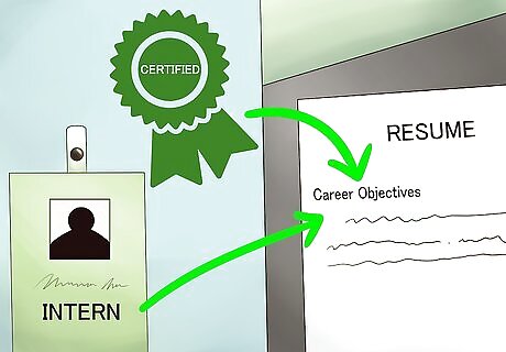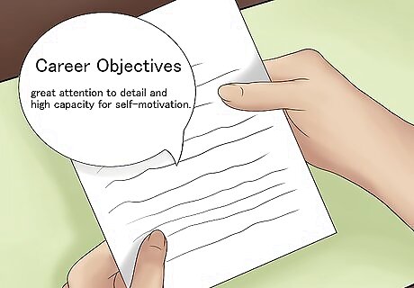 Include different facts depending on your level of experience. What you should include in a career objective depends on your level of experience. If you're a high school or college student looking for entry level work, your career objective would be much different than someone with much experience in a given field. If you're a high school student, a career objective should focus on general traits or values you possess. You should include a self introduction, measuring your strongest qualities, information about what role in a company you're hoping to fill, and an emphasis on your reliability as a job candidate. For example, something like, "Dedicated student with a strong GPA and high work ethic. Seeking to use my abilities as student intern. I am very dedicated and goal-oriented and can help benefit the goals of your company." If you're a college student, you're likely looking for entry level of internship experience. Your objective should include your degree, level of experience, your strongest traits, and an emphasis that you're hardworking and reliable. Something like, "Recent college graduate with a marketing degree and two years of social media marketing experience. Seeking further experience in the field of online marketing. A dedicated, detail-oriented worker with experience in SEO, web copy, and social media management." If you're a professional in the field already, you usually include a career objective if you're changing careers. Mention how many years experience you have, the qualities that would make you a strong candidate for a position, and any relevant education or certifications. For example, "Grant writer with 6+ years in the nonprofit sector. Aiming to use my written communication and fundraising skills to help your organization increase awareness of world poverty. Possess an MA in nonprofit management."