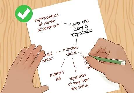 Brainstorm to come up with ideas. Now that you've done your research, you're ready to put together some ideas for your essay. There are lots of ways to brainstorm, and you'll probably find that you prefer one over others. In any case, it's best to jot down your ideas by hand when you brainstorm instead of keeping them all jumbled in your head. You could write down main ideas or keywords in bubbles or clouds. Draw lines between connected concepts and make smaller bubbles for terms connected to larger ideas. Bullet point lists could help you gain a bird's-eye-view over your material. For a literary analysis, you could list examples for categories such as “Literary Devices” or “Key Events.” Try journaling or free-writing to get your creative juices flowing. Write what you know about the topic for 15 or 20 minutes without censoring your ideas.
