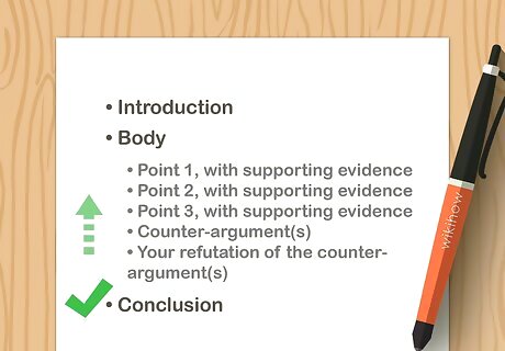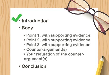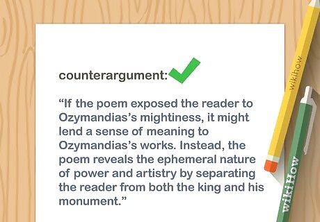 Strengthen your claim by addressing a counterargument. While you won't always need a counterargument, including one makes your thesis more convincing. After building your argument, mention an opposing viewpoint. Then explain why that perspective is incorrect or fails to prove you wrong. Suppose you've argued that a military conflict was caused by increasing nationalism and competition over resources. A scholar previously claimed that the conflict was solely instigated by the involved nations' authoritarian governments. You'd mention that this argument ignores the underlying tensions that set the stage for the conflict. Good ways to address a counterargument include refutation (where you provide evidence that weakens or disproves the opposing perspective) and rebuttal (in which you offer evidence that shows that your argument is stronger).