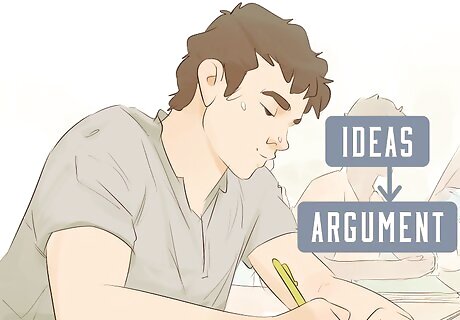 Organize your ideas into an argument. Review your prompt, brainstorming materials, and research notes. Write down a few main ideas you want to focus on, then revise those ideas into an assertion that responds to the essay prompt. Try to find an overarching argument or idea that encompasses all the major points you want to address. Suppose you need to compare and contrast 2 literary works. You've analyzed each example, and you've identified how their elements function. They both employ nostalgic appeals to emotion, so you'll assert that the works use similar persuasive strategies to advance opposed ideologies.