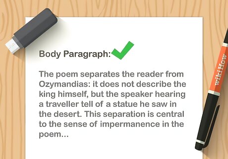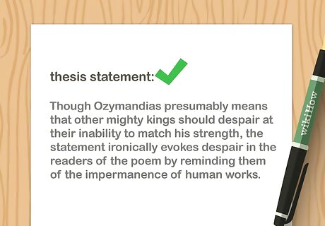 Come up with a concise thesis statement. Refine your argument into a clear and concise sentence, which will serve as your essay's thesis. While your thesis will help you stay on track through the drafting process, bear in mind you'll likely tweak it as your essay evolves. You'll include your thesis in the introduction. It lets the reader know exactly what you're trying to prove. Note that you should just write your claim; don't start your thesis with “I will prove that,” or “It will be shown that.” Early in the drafting process, your working thesis could be “Charles Baudelaire's experiences of city life and travel abroad shaped his poetry's central themes.” As your essay takes shape, refine your thesis further: “Drawing on experiences of urban life and exotic travel, Charles Baudelaire reinterpreted la voyage, a primary theme of French Romantic poetry.”