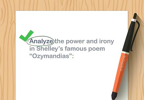 Read your assignment carefully. Review the prompt and ensure you clearly understand the assignment. Look for keywords such as “analyze,” “explain,” and “compare and contrast.” These words will let you know exactly what your essay needs to accomplish. For example, “analyze” means to pull apart. The prompt “Analyze a poem by Charles Baudelaire” is asking you to divide a poem into specific elements and explain how they function. Note any details such as “Compare and contrast 2 short stories not discussed in class.” Discuss the similarities and differences of your examples' literary devices, and be sure to choose stories that weren't covered in class. Your assignment instructions may include a breakdown of how your work will be graded (e.g., a certain number of points may be awarded based on organization, spelling and grammar, or the strength of your sources). If the grading criteria aren't clearly explained in the instructions, ask your teacher or professor to explain their rubric. If any part of the prompt seems unclear or confusing, don't hesitate to ask your professor for help.