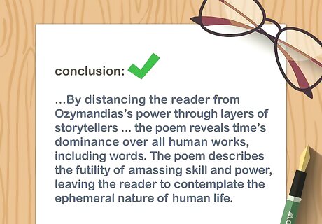 Pull your points together in your conclusion. A strong conclusion does more than simply repeat the introduction's content with different wording. While you should restate your thesis and remind the reader of your evidence, you should also offer a resolution. Provide an insight, broader implications of your argument, or a practical way to apply the information you've gleaned. For instance, if you argued about how a rising tide of nationalism led to a military conflict, you could write, “Unwillingness to find diplomatic solutions, bolstered by the belief of national superiority, led to this particular conflict. So too, on a global scale, rising tides of nationalism threaten the political and economic bonds of the international community.”