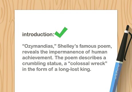 Write your introduction. Depending on your assignment, you might start off with an attention-grabbing topic sentence. However, it's common for academic essays to get straight to the point and put the thesis front and center. The sentences after the thesis then map out the rest of the essay, which lets the reader know what to expect in the coming paragraphs. The road map should mention the evidence you'll use to prove the thesis. For example, “Analyses of the key poetic elements, along with discussion of autobiographical excerpts, will show how Baudelaire imagined la voyage as darker and more complicated than his Romantic predecessors.” Some people prefer to write the introduction before making an outline. Do whichever feels more comfortable. Your outline could help you structure your introduction, or your intro might lay out a road map for your outline.