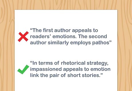 Switch up your sentence structures. Look for any spots where your sentence structures get repetitive. If necessary, add variety to your phrasing to make your essay more engaging and readable. The sentences, “The first author appeals to readers' emotions. The second author similarly employs pathos,” are boring and repetitive. A better structure could be, “In terms of rhetorical strategy, impassioned appeals to emotion link the pair of short stories.”