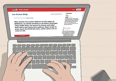 Provide an overview of the basics, like date, time, cost, location, and parking. Community members want to know what to expect from a business. Include information about what goods and services an establishment offers and how much their goods or services cost. Additionally, mention the neighborhood or part of the city where the establishment is located, as well as where patrons can park. Give your readers the date you went and time as well. The date tells the readers how relevant the review is. The time helps them correlate rush-time, off season service and view versus otherwise. Write, “This quaint ice cream shop is on the edge of Midtown, so street parking is all that’s available. They make their ice cream in-house and offer both dairy and dairy-free options. Cups range in price from $3.50-$6.00 each, while cones are an extra $1.00."
