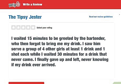 Use facts rather than emotions when backing up your claims. A bad experience can leave you feeling angry, ignored, and frustrated. While you have every right to feel that way, don’t let these emotions cloud your review. Instead, provide factual details about what happened and leave out how it made you feel. Don’t write something like, “Going to this bar ruined my Friday night. The bartender ignored me all night in favor of a group of hot girls. I felt like total crap and ended up going home early.” Write something like this instead: “I waited 15 minutes to be greeted by the bartender, who then forgot to bring me my drink. I saw him serve a group of 4 other girls at least 1 drink and 1 shot each while I waited 30 minutes for a drink that never came. I finally gave up and left, never knowing if my drink ever arrived.”