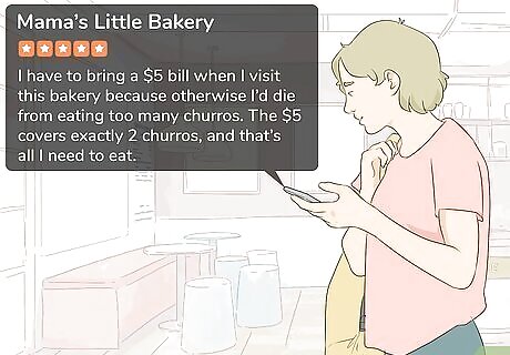 Incorporate humor so community members want to keep reading. While it’s not a requirement that you be funny, including jokes and amusing observations in your review can help people enjoy it more. When writing a humorous review, stick to light-hearted jokes and skip the sarcasm. You might write something like, “I have to bring a $5 bill when I visit this bakery because otherwise I’d die from eating too many churros. The $5 covers exactly 2 churros, and that’s all I need to eat,” or “It took so long for them to bring me sour cream and butter that my potato started growing roots.”