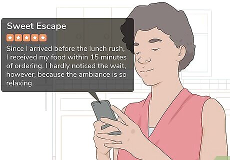 Tell community members how long you waited to be served. Don’t just discuss how long you waited when you had a bad experience. Make a habit of including your wait time in every review. Be specific about the time frame, how many other customers were present, and how you felt while you waited. Write something like, “Since I arrived before the lunch rush, I received my food within 15 minutes of ordering. I hardly noticed the wait, however, because the ambiance is so relaxing.”
