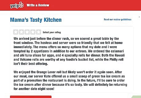 Tell a story so your review engages readers. People love a good story, so use your experience to craft a good tale. Instead of listing why you did or didn’t like a business, describe your experience from start to finish. Be concise but provide enough details for readers to follow along. You could write, “We arrived just before the dinner rush, so we scored a great table by the front window. The hostess and server were so friendly that we felt at home immediately. The menu offers so many options that my date and I were tempted by 2 appetizers in addition to our entrees. We ordered the calamari and ahi tuna slices for apps, and 4 specialty rolls for dinner. Both the Hawaii and Volcano rolls are worthy of any foodie’s bucket list, while the Philly roll isn’t their best offering. We enjoyed the Orange Lover roll but likely won’t order it again soon. After our meal, our server Kate offered us a small scoop of green tea ice cream as part of a promotion the restaurant is doing. In the future, I’ll be sure to order the ice cream after dinner because it’s so tasty. We will definitely be returning for another date night soon!”
