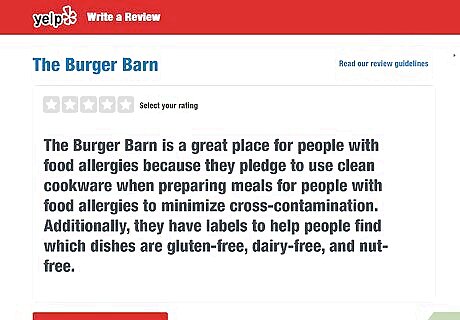 Offer tips for a specific diet or personal identity if applicable. Your unique perspective may be helpful to other readers if you follow a special diet or are a member of a particular group. Incorporate your tips for users who might be similar to you. For instance, you might discuss how a restaurant’s menu accounts for people with food allergies or which entrees fit a keto diet plan. Similarly, you might highlight a cafe’s Pride decorations if you’re a member of the LGBTQ+ community or a business's accessibility if you have a physical limitation. Write something like, “The Burger Barn is a great place for people with food allergies because they pledge to use clean cookware when preparing meals for people with food allergies to minimize cross-contamination. Additionally, they have labels to help people find which dishes are gluten-free, dairy-free, and nut-free.”