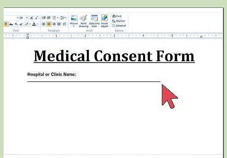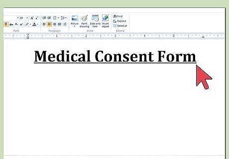 Open a word processing document. You should make sure that the font and type is a comfortable size so that your patients can read the information on the form. At the very top of the page, title the document “Medical Consent Form.” Put the title in bold.