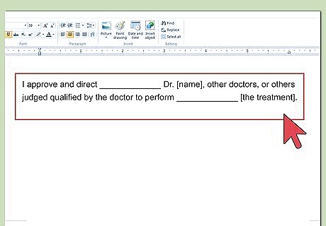 Identify the doctors. The medical consent form should start off with the patient giving consent to a doctor, who is named. You could type, “I approve and direct Dr. [name], other doctors, or others judged qualified by the doctor to perform [the treatment].” If more than one doctor practices in your office, you can leave the doctor’s name line blank and fill in the form individually for each patient. If you provide more than one standard treatment, then you can insert a blank line where “the treatment” appears. Some doctors, however, only perform one kind of surgery, e.g., cesarean section deliveries. If that is your situation, then you might want to type in the procedure you perform regularly. You can also create separate medical consent forms for each of your most common procedures.