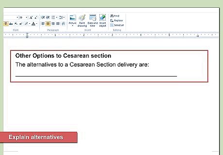 Explain alternatives. You should notify all patients of alternatives to the proposed treatment. This information should also appear in the medical consent form. Title the section, “Other Options to ______” and fill in the blank with the proposed procedure. Then you can list the alternatives. You should also explain the risks of proposed alternatives. You should leave space to do this.