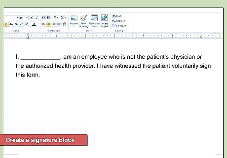 Create a signature block. There should be space, at the bottom of the document, for the patient or legal guardian to sign and date. You also should create space for a witness’s signature and for a translator’s signature. For the witness’s signature, include this language: “I, ______, am an employee who is not the patient’s physician or the authorized health provider. I have witnessed the patient voluntarily sign this form.” Then include a signature line underneath. For the translator, include this language: “To the best of my knowledge, the patient understood what was translated and voluntarily signed the form.”