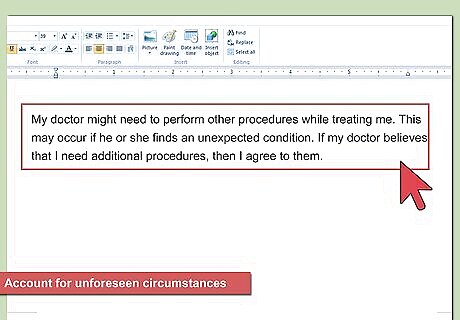 Account for unforeseen circumstances. In addition to gaining consent for the medical procedure, you need to get patient consent for unforeseen or unexpected conditions. You need to have the patient consent to additional procedures because it is illegal to expand the scope of a surgery or other treatment without consent. You can type, “My doctor might need to perform other procedures while treating me. This may occur if he or she finds an unexpected condition. If my doctor believes that I need additional procedures, then I agree to them.”