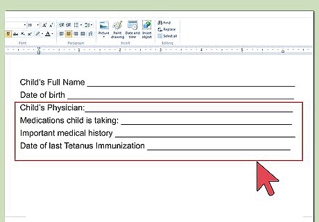 Include medical information. Upfront, you should include medical information about the children, including their doctor, health insurance plan, and allergies. You should title this section “Information for Medical Treatment.”
