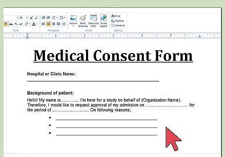 Identify its purpose. If you are a doctor, then you need to make sure that you get informed consent from your patients before providing health care. Accordingly, you need to document that you gave the patient all relevant information about the medical condition and the proposed treatment. Because you need to use this form over and over, with each new patient, it will be basically a template that allows you to fill in information unique to the patient you are meeting with.