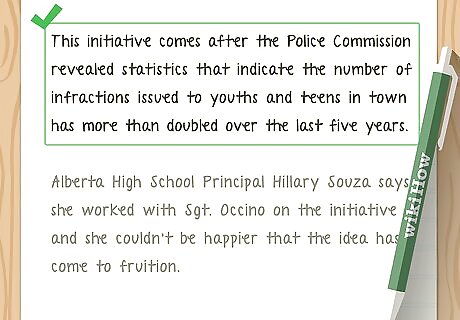 Give all the important details. The next important step to writing news articles is including all the relevant facts and details that relate to your lead statement. Include the basics of what happened, where and when it took place, who is involved and why it's newsworthy. These details are important, because they are the focal point of the article that fully informs the reader. If you are writing an opinion piece, this is where you will state what your opinion is as well.