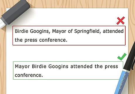 Follow the AP Style for formatting and citing sources. Journalists, and therefore news articles follow AP Style for sources and citations in most cases. The AP Style book is a journalist’s textbook and should be consulted for proper formatting. When quoting someone, write down exactly what was said inside quotations and immediately cite the reference with the person’s proper title. Formal titles should be capitalized and appear before a person’s name. Ex: “Mayor John Smith”. Always write out numbers one through nine, but use numerals for numbers 10 and up. When writing a news article, be sure to only include one space after a period, not two.