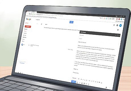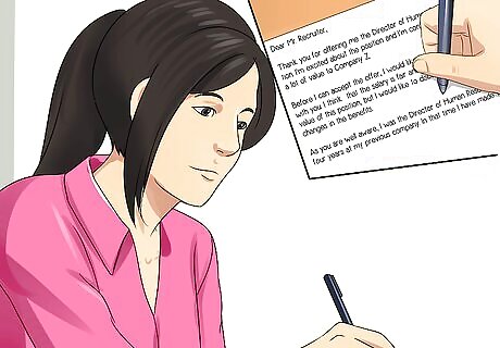 Format your letter. Even if you're sending your letter using email, you want to use a formal business format and address your letter to a specific person – typically the person who presented the original offer, unless they've indicated you should direct correspondence to someone else. If you're addressing the letter to someone other than the person who presented you with the initial offer – say, because your initial offer was provided by a recruiter or other interviewer on behalf of the person who will actually be doing the hiring – mention the person with whom you spoke by name. Generally, your text should be single-spaced, with a double-space between paragraphs. When you're ready to sign off, use your full name and a closing such as "thank you." You may want to include your phone number under your name if you're not printing the letter on letterhead or sending it from an email address that has a signature line that includes contact information. If you're sending your letter using email, make sure you're using an appropriate email address. If you have a cutesy email address that you use for personal communication, set up another one with a free provider that you can use for more serious, business communications.