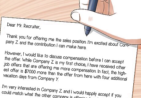 Set out your terms. Based on the reasons you've described, state a specific salary you want, including additional benefits or other options. While you don't want to ask for an amount that's too high, you still want to leave room to negotiate. If you're willing to exchange certain benefits for others, state this clearly. For example, if you have no need for the reserved parking spot because you don't have a car, but would like a week more of paid vacation time than was initially offered, you might present this exchange. Be careful not to state your terms as a demand, but as a counter-offer. Stress that you're open to discussion. If you have other job offers from other companies, you might be able to mention these and use them as leverage. However, don't make up offers that you don't have – you don't know who the hiring manager or others in the company know in the industry. If they are able to find out with a quick phone call that you never received such an offer, even your initial offer may evaporate.