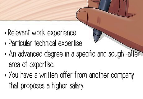 List the reasons you are worth more. Highlight points on your resumé that show you have experience or education that should command a higher salary or greater benefits. Here you can use the knowledge you gleaned about how your offer was determined, and bring up or expand on aspects of your background they may not have taken into consideration. For example, if you know that the offer you received is the same offer the company gives all new hires, you can point out the additional value you bring to the position, or the experience you have that many other new hires may not. You also have the opportunity to include information you may not have noted on your resumé, or to expand on the brief descriptions of your experience that you already gave them. To this end, you may want to think about what hypothetical person they have in mind who is worth that initial offer. Then you can explain how you are worth more than that hypothetical person. Try to keep this paragraph brief, but focus on specific examples that demonstrate you are worth more than the compensation in the initial offer. If what you want is less about getting more money and more about something such as a change in job title, provide reasons for your request based on what you know about the job responsibilities of the position they've offered you. If you're asking for the company to help cover relocation expenses because you have to move to accept the position, keep in mind that they may decide they could simply hire someone who already lived in the area. You want to show that you have unique value to add and that they won't find anyone comparable to you for less.
