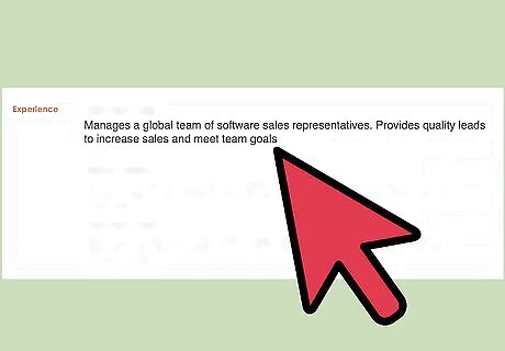 Write a brief description of your duties for each relevant job. The short paragraph that accompanies each job listing should also be tailored: for each past position, construct two to five sentences that explain your experience and connect it to this potential job. For example, you might write, “Manages a global team of software sales representatives. Provides quality leads to increase sales and meet team goals.”