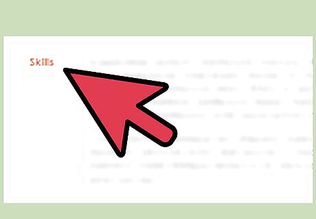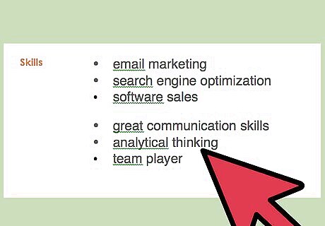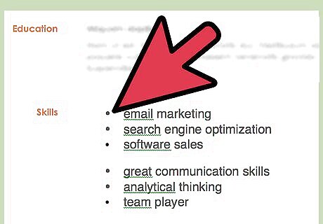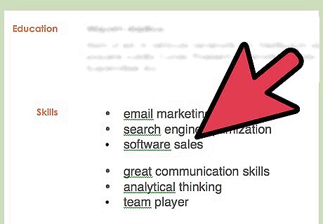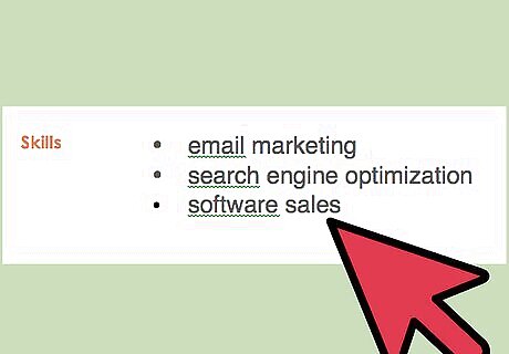 Use a bulleted list. List relevant hard and soft skills on a bulleted list. Keep in professional looking: use simple bullet points, dots, or dashes. Consider using two or three columns for your skills section. Doing so keeps the section from appearing unnecessarily lengthy.