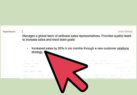Add bullet points listing your most attractive accomplishments for each job. Consider your most outstanding accomplishments or duties that are relevant to the potential job, and list these in bullet points to make them easily readable. This is a good place to include quantifiable results as well. For example, you might write: “Increased sales by 30% in six months through a new customer relations strategy.”