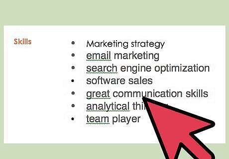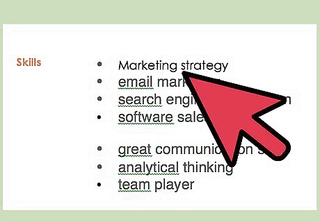 Provide three to five essential skills directly under the job title. Under your new heading, list a few of your most significant skills. These should be tailored to the particular job, so think carefully about the advertisement, and decide which of your qualifications seem most crucial. Separate these skills with a slash. For example, if you are applying for a marketing manager position, you might write: “Marketing Strategy / Customer Behavior / Search Engine Optimization”
