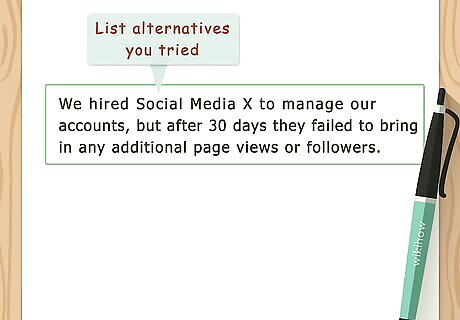 List alternatives you tried. If relevant, you might also include a line or two about other products or services you used in an attempt to solve your problem. Describe specific ways those products or services failed to help you. Listing alternatives can be especially beneficial if you tried a direct competitor and they were unable to solve your problem. To continue with the social media example, you might say "We hired Social Media X to manage our accounts, but after 30 days they failed to bring in any additional page views or followers." Include a personal note regarding how it made you feel to try different alternatives and have them all fail. Readers will empathize with you and be drawn into your story.