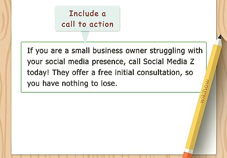 Include a call to action. You could close your testimonial with your recommendation. However, if you're confident enough, you might provide further encouragement for readers to reach out to the company offering the product or service. For example, you might say "If you are a small business owner struggling with your social media presence, call Social Media Z today! They offer a free initial consultation, so you have nothing to lose."