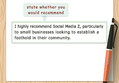 State whether you would recommend the product or service to others. It may seem like a no-brainer, but the best testimonial should include specific words indicating that you want to encourage others to use the product or service as well. Depending on the product or service you're writing about, you may want to directly target specific people. For example, you might write "I highly recommend Social Media Z, particularly to small businesses looking to establish a foothold in their community."