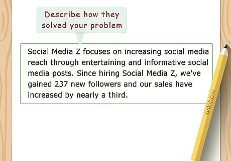 Describe how the product or service solved your problem. Start a new paragraph, and turn your attention to the product or service you're writing your testimonial about. List two or three important facts about the product or service. Take a moment to introduce the product or service and talk a little about what it is or what it does. Then state specifically what it did for you and how it helped you. For example, you might say "Social Media Z focuses on increasing social media reach through entertaining and informative social media posts. Since hiring Social Media Z, we've gained 237 new followers and our sales have increased by nearly a third." Highlight a unique or creative approach. If there's something about the business or product that sets it apart from competitors, talk about that thing specifically. Mention if custom solutions were offered that were tailored specifically to your problem. It can help to describe your expectations, if they help put the creativity of the business you're talking about into perspective. For example, you might write "I didn't expect Social Media Z to get us more than 20 or 30 followers, but they found a way to bring in ten times as many people."