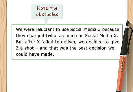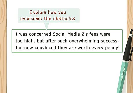 Note any obstacles. Every product or service has its drawbacks. If there was some reason you initially rejected the product or service you writing about, talk about how you got past that issue. Then you can transition smoothly into the solution of your problem. Cost typically is one potential obstacle. For example, you might say, "We were reluctant to use Social Media Z because they charged twice as much as Social Media X. But after X failed to deliver, we decided to give Z a shot – and that was the best decision we could have made."