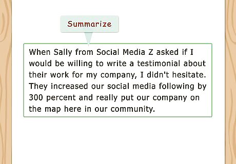 Summarize your experience. Use the third paragraph of your testimonial to briefly recap how the product or service you're writing about solved your problem. You might also add something about why you are writing a testimonial. For example, if the company providing the product or service asked you for a testimonial, you might say "When Sally from Social Media Z asked if I would be willing to write a testimonial about their work for my company, I didn't hesitate. They increased our social media following by 300 percent and really put our company on the map here in our community."