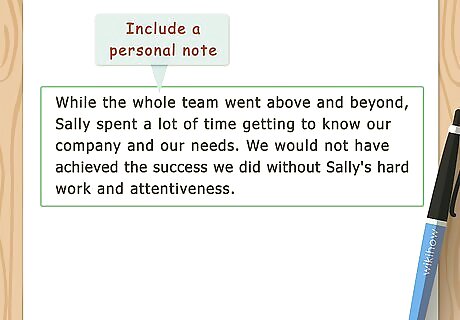 Include a personal note. If your contact person was a pleasure to work with, or if the company went above and beyond the call of duty, make an enthusiastic note about this. If you worked closely with a particular employee, mention them by name. Personal notes also mean something to the people you name, and can help employers identify and reward their best employees. If someone specific impressed you, talk about them in your testimonial. For example, you might write "While the whole team went above and beyond, Sally spent a lot of time getting to know our company and our needs. We would not have achieved the success we did without Sally's hard work and attentiveness."